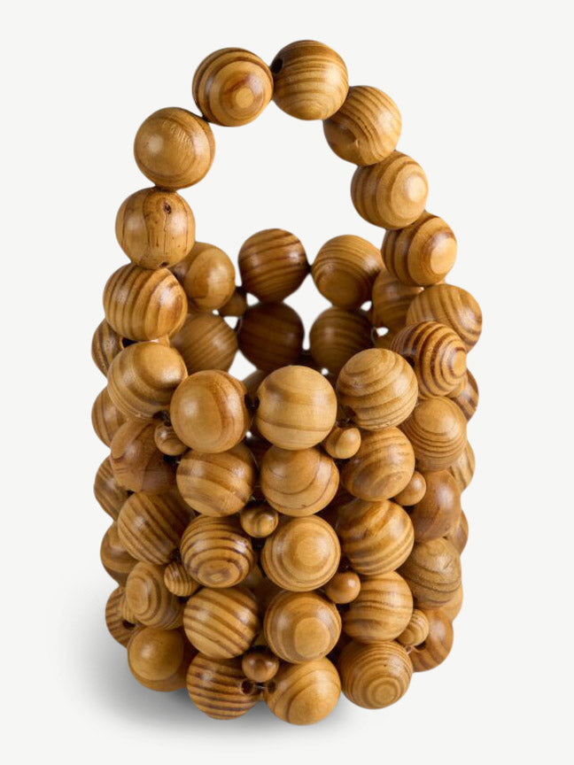 The GENESIS bag is a striking fusion of artistry and craftsmanship, featuring large arabesque wooden beads intricately assembled into a bold cylindrical silhouette. Its beaded handle adds a touch of elegance, making it a versatile companion for any occasion.