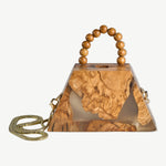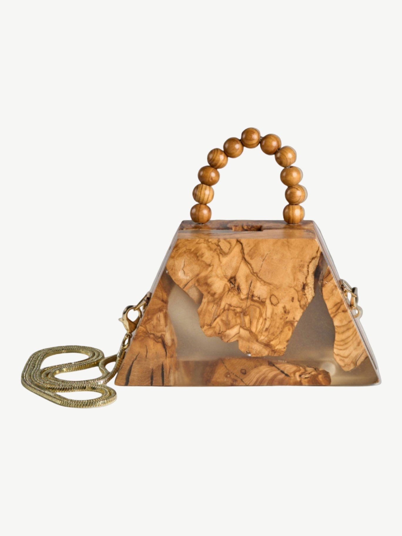 The KHUFU bag is a stunning blend of Olive wood and resin, forming a distinctive, near-triangle silhouette that radiates both sophistication and natural beauty. Designed for the modern minimalist with an appreciation for craftsmanship, KHUFU is adorned with small arabesque bead handles, adding an artistic and textured touch.