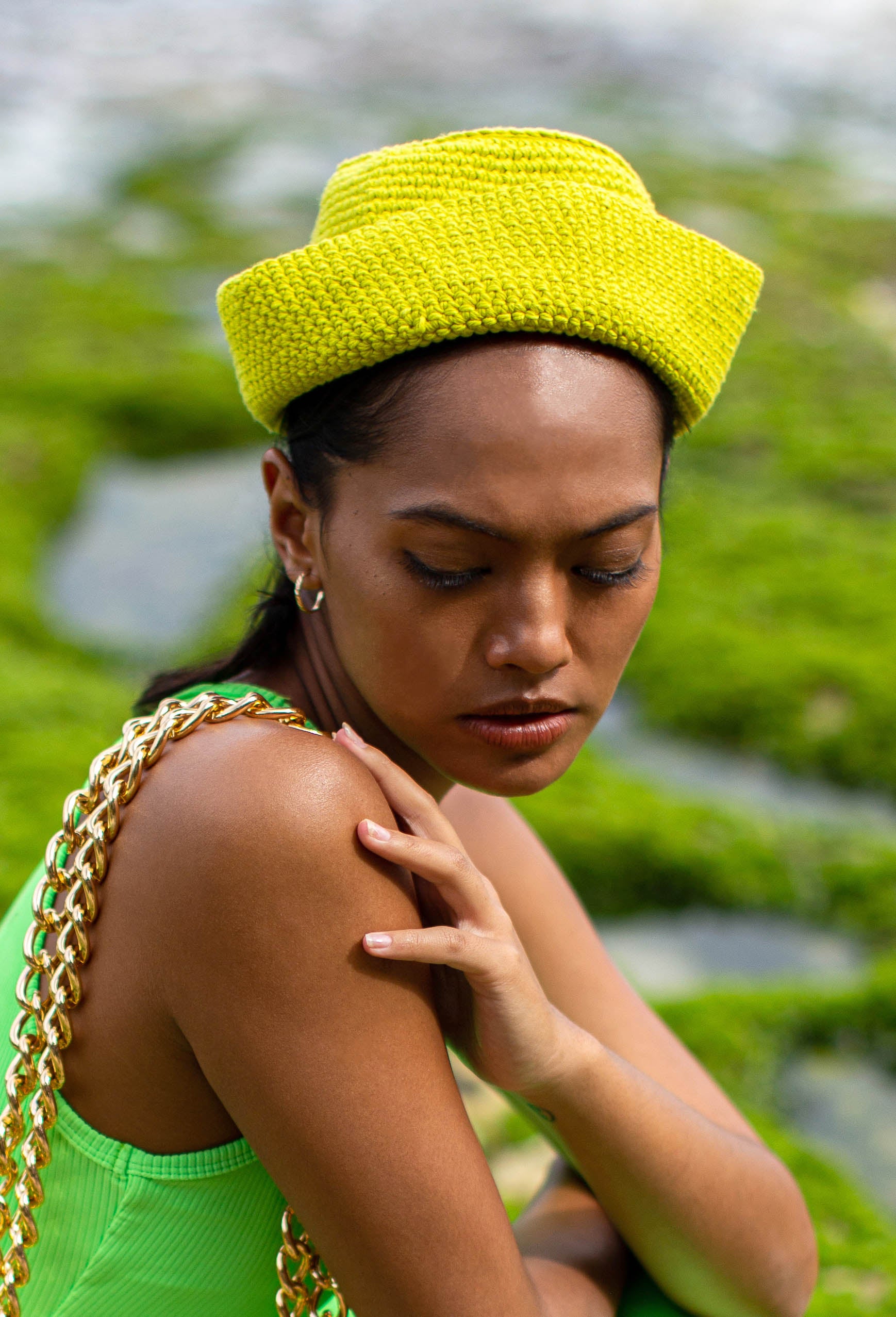 Gani hat is hand-crocheted in breathable cotton yarn by our local artisans in Java island. Featuring a modern twist of the cloche hat shape, this hat has sturdy textures and fluid proportions. Fold the brim part to shape it into a sailor hat style.