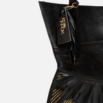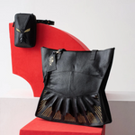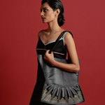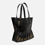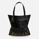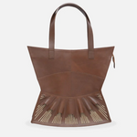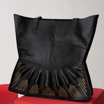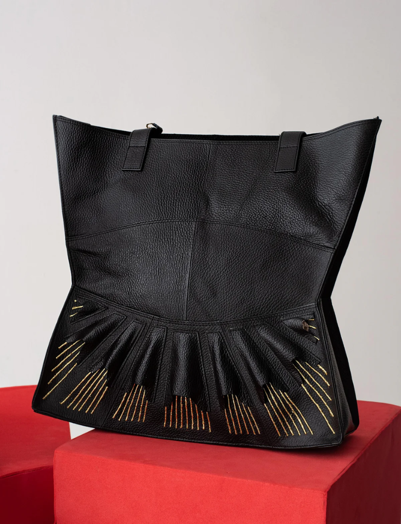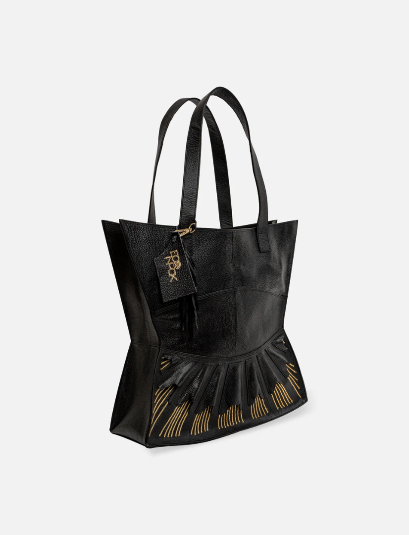 The Urumi Tote Bag features gold-toned hardware and an open-top design for easy access. It includes a secure inner zippered pocket to keep valuables safe. The tote is spacious enough to fit a laptop or tablet up to 12 inches. Each bag is carefully packaged in a muslin dust-sleeve, supporting a plastic-free, zero-waste packaging approach.