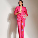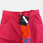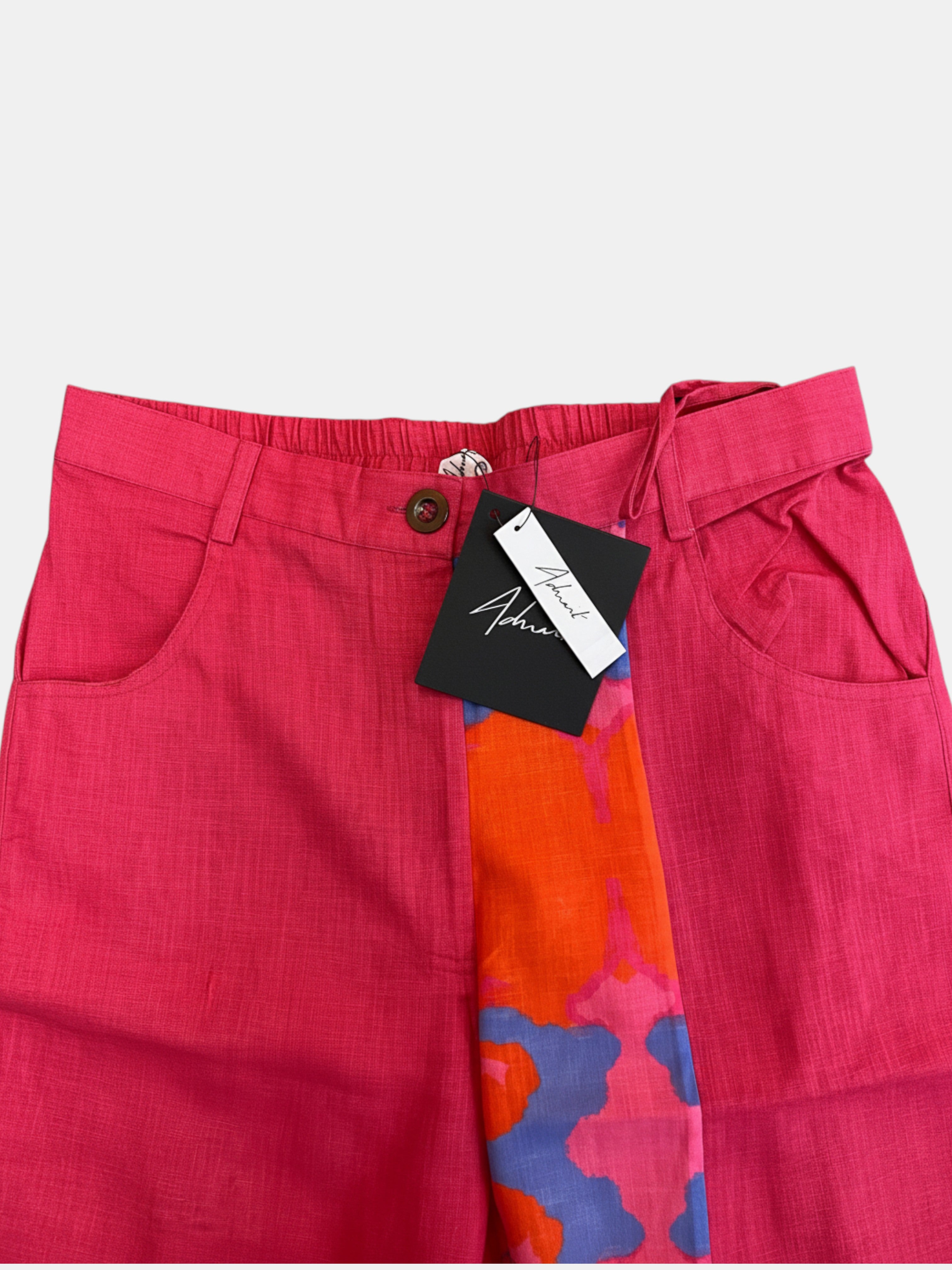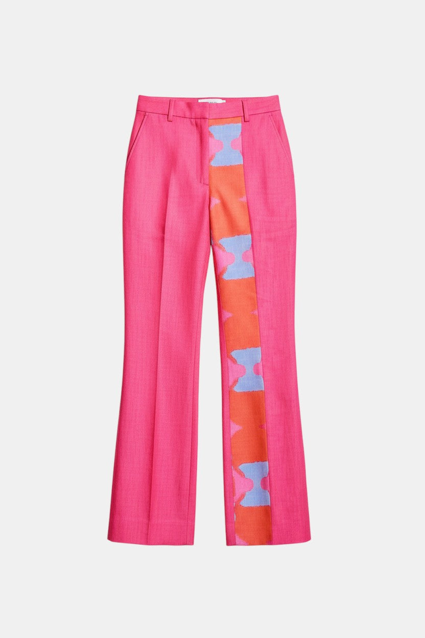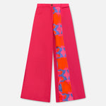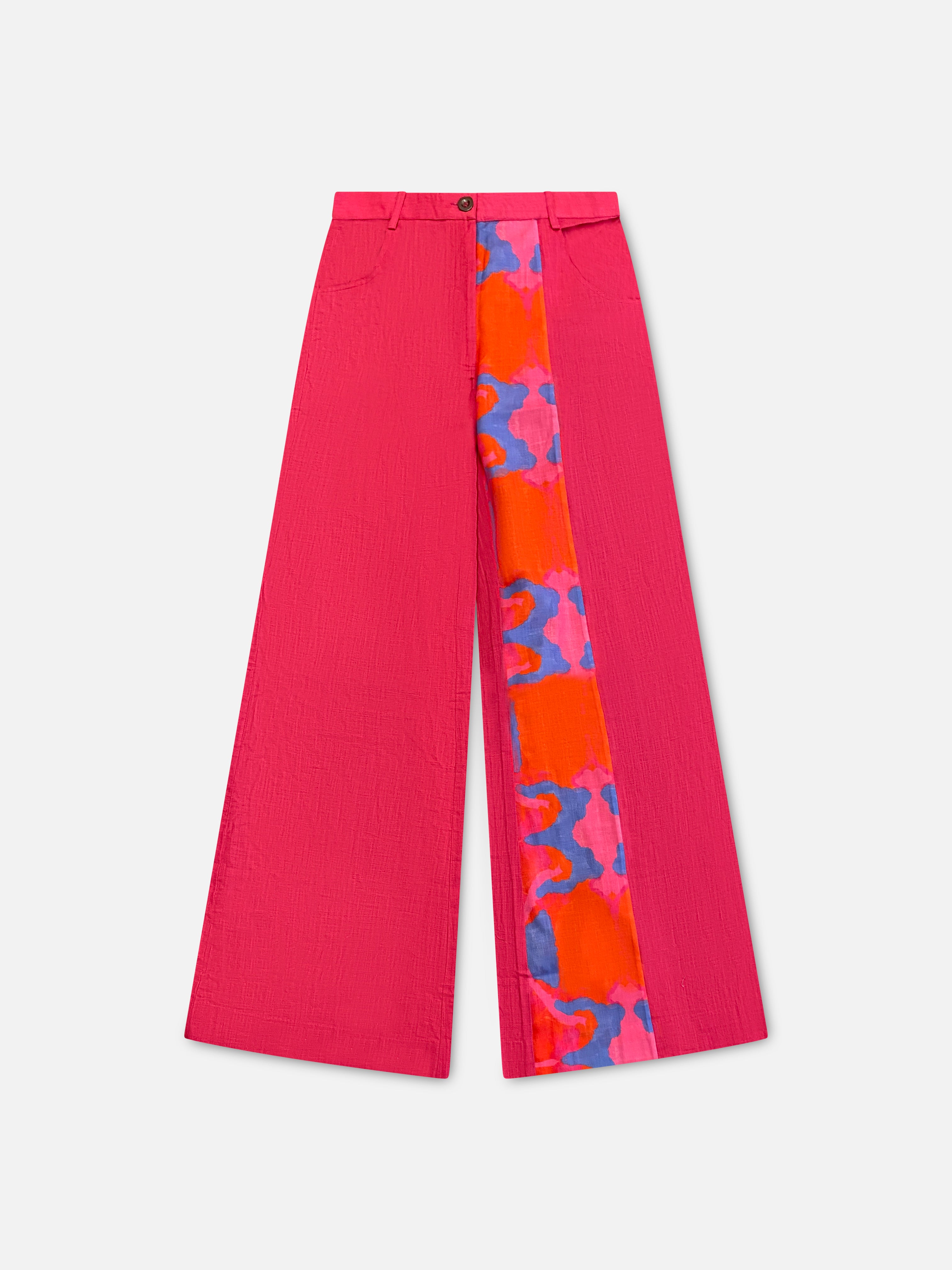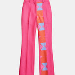 Featuring pink flared pants in cotton linen base with print and patch work.