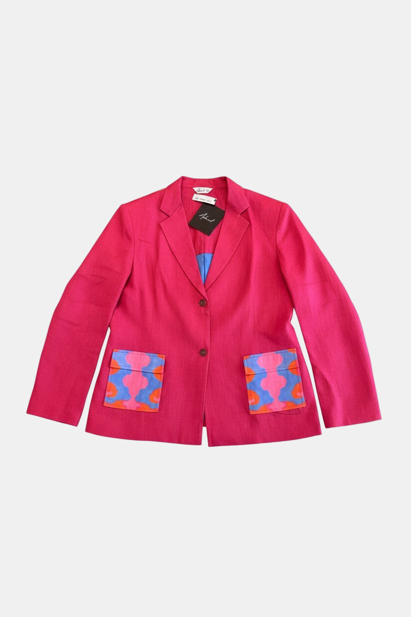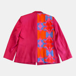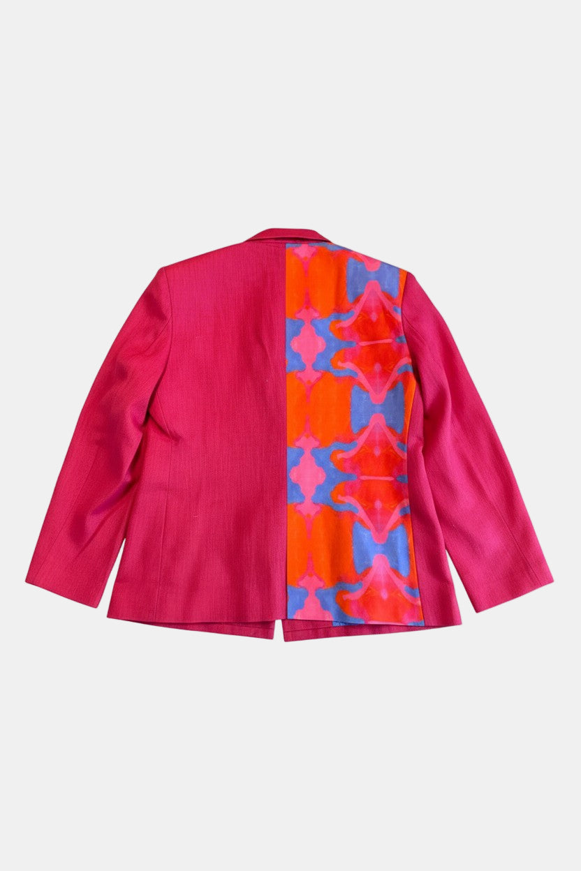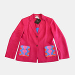 Featuring a pink blazer in cotton linen base with print and patch work.