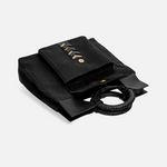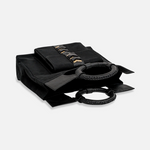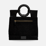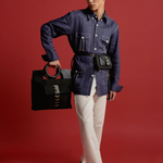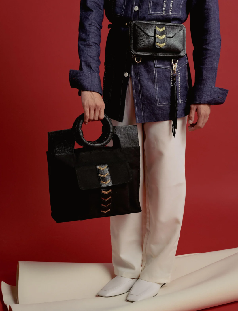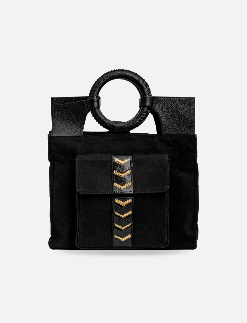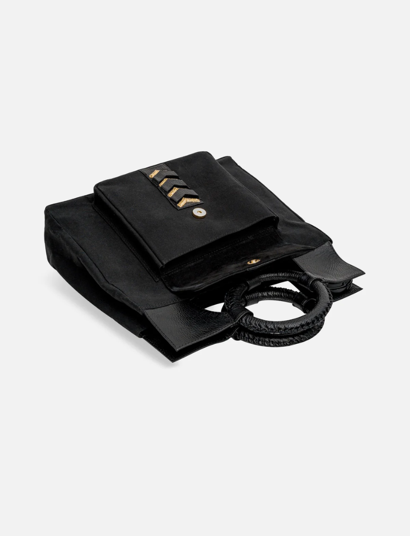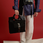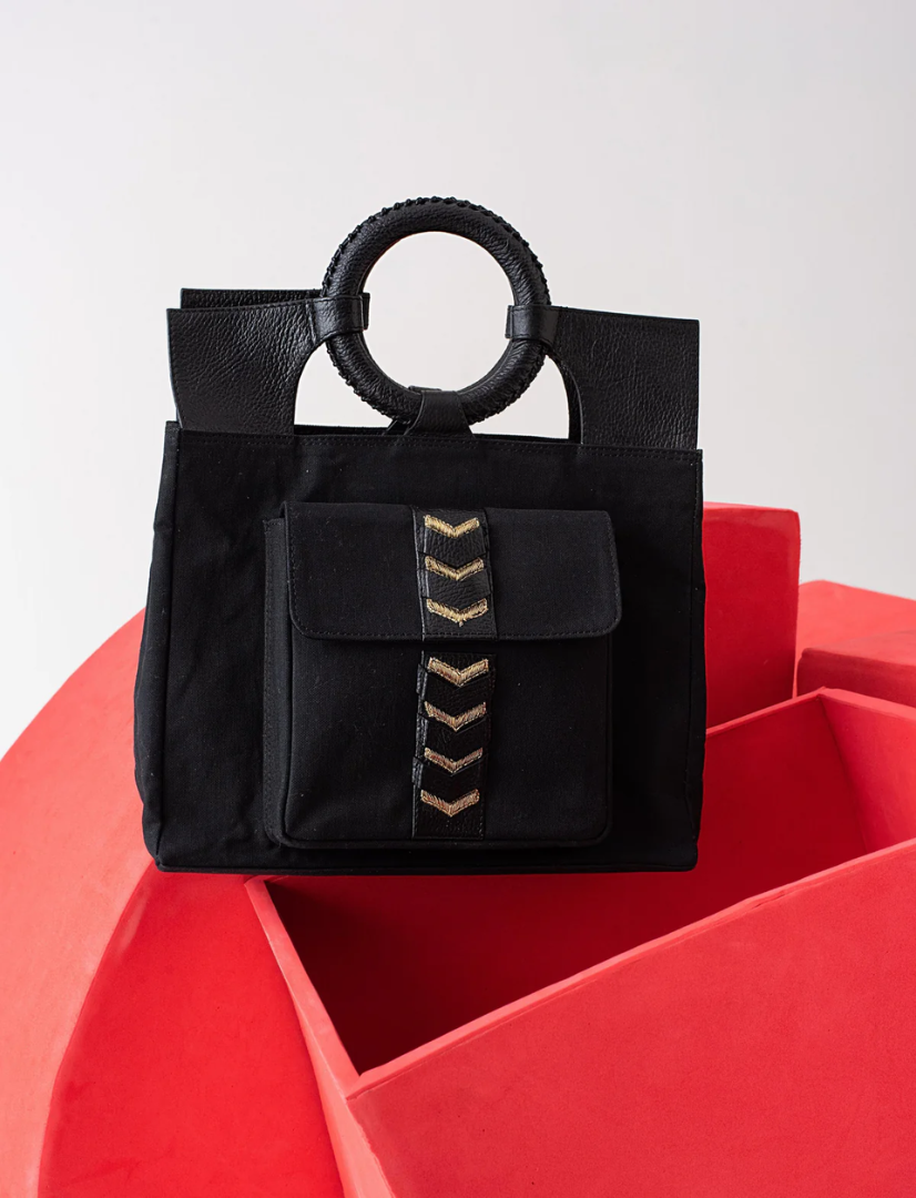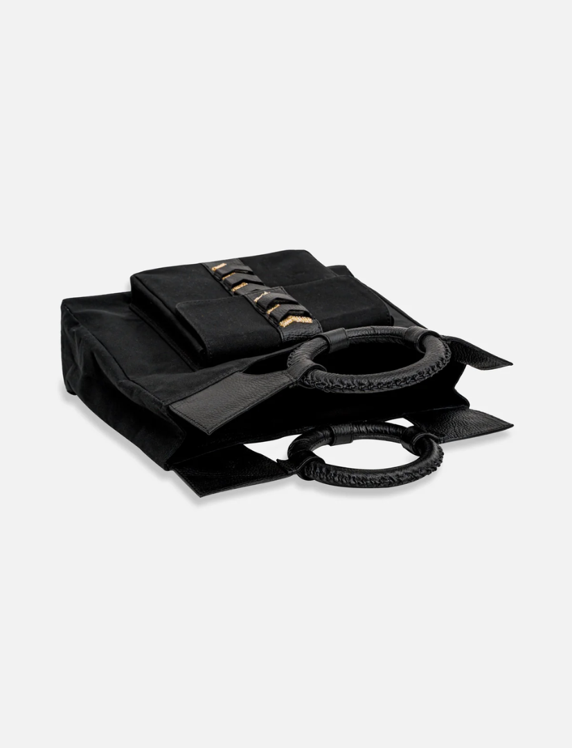 The CHAKRAM Mini Tote is a bold fusion of cultural heritage and contemporary design. Inspired by the traditional Indian throwing weapon, the Chakram, this tote reimagines its circular form into a sleek, structured silhouette. Crafted from upcycled black leather, it features a striking gold-toned motif reminiscent of an armed general, symbolizing strength and elegance. Designed for those who appreciate a powerful aesthetic, this tote is perfect for various occasions, from casual outings to more formal events.